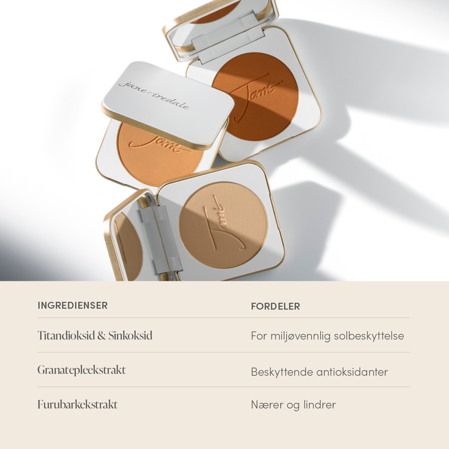 Oljefri, fast mineralfoundation med rene og finknuste mineraler som gir en semi-matt og jevn hudoverflate. Produktet fungerer både som foundation, concealer og solfaktor i ett og samme produkt.