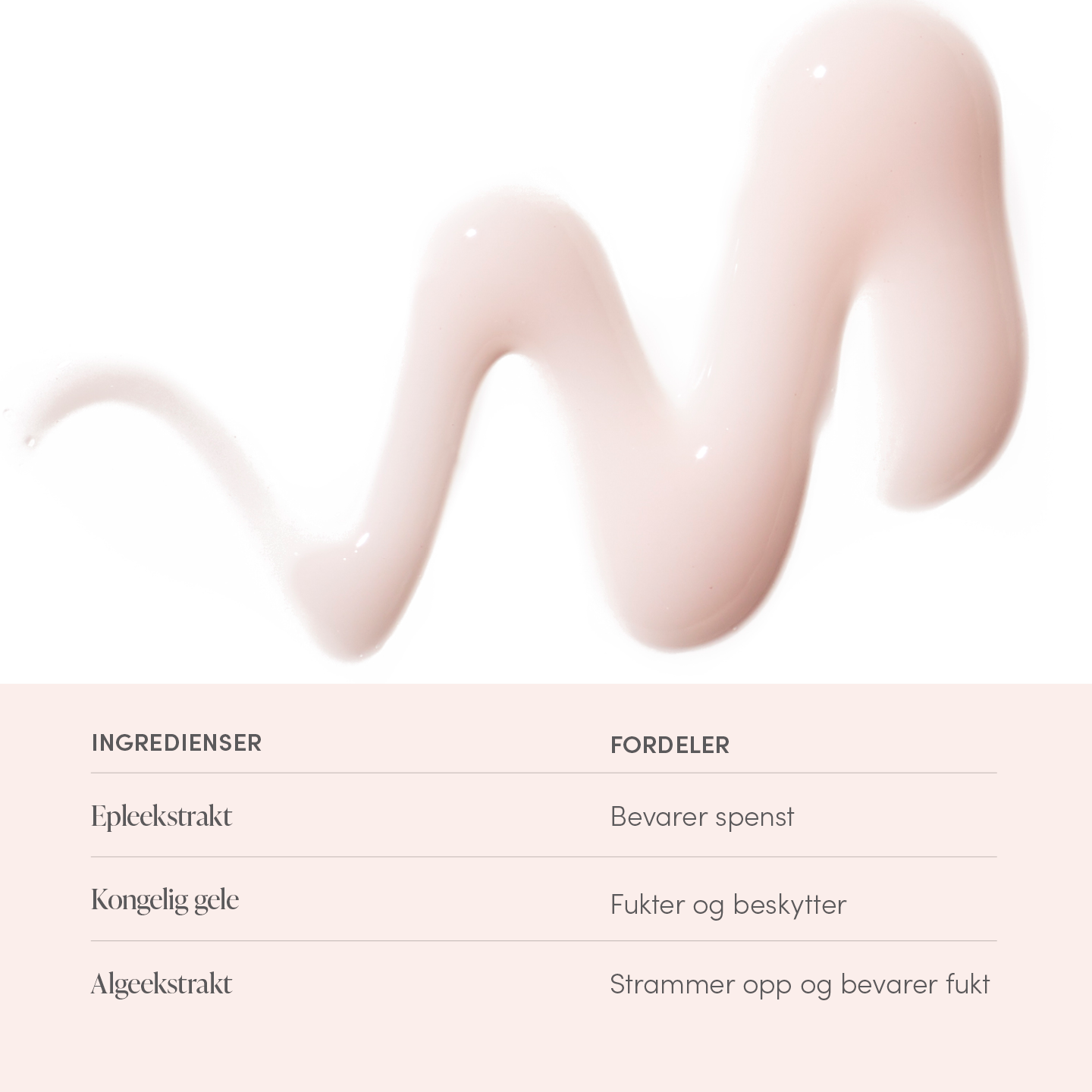 Antioksidanter fra eple beskytter og reparerer huden, mens Royal Jelly fukter og plumper for et glødende, jevnt resultat. Algeekstrakter jobber mot aldring ved å stramme opp og fornye huden.