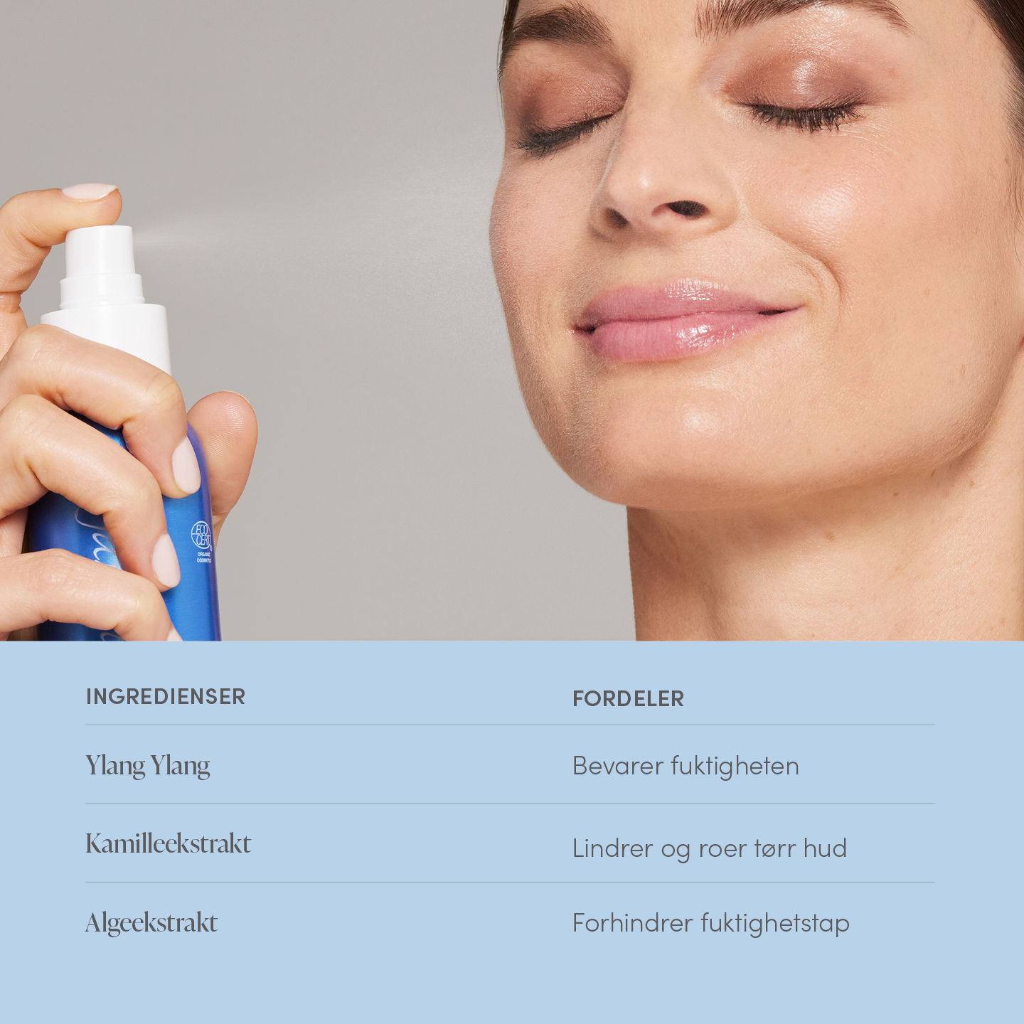 Fuktighetsspray med ylang ylang som fukter og roer huden i tillegg til å fiksere din makeup så den sitter hele dagen