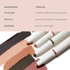 Hydrogenated Jojoba Oil, Synthetic Wax, Trimethylsiloxysilicate/Dimethiconol Crosspolymer, Glyceryl Caprylate, Silica Silylate, Pentaerythrityl Tetra-Di-T-Butyl Hydroxyhydrocinnamate, Ceramide NP, Ascorbyl Palmitate, Ethylene/Methacrylate Copolymer, Isopropyl Titanium Triisostearate, [+/- Titanium Dioxide (CI 77891), Iron Oxides (CI 77491, CI 77499, CI